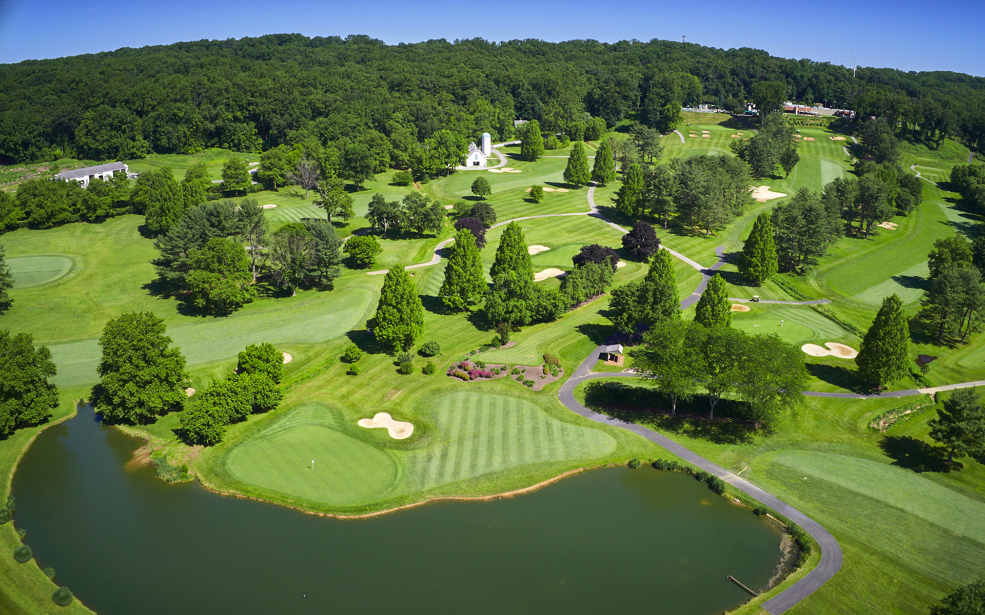 One of the most scenic tee shots on the property- views of downtown Towson, MD in the distance, and the Loch Raven Reservoir make this a picturesque tee shot. Slight dogleg right Par 4 with a creek running through the fairway, and fairway bunkers on the left and right side. The creek is approximately 100 yards from the green. Bunkers guard the green long and right side of the green. Putting Green runs from back to front. *Player Note: Longer hitters can carry over the creek without any issues, but be careful of which direction the wind is blowing.